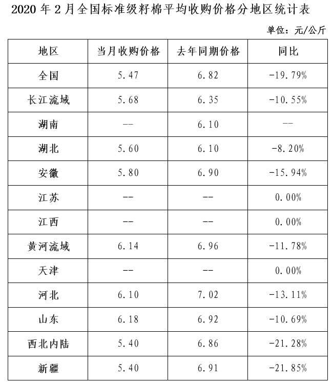 截止到2月29日全國(guó)400型棉花加工企業(yè)3128級(jí)籽棉平均收購(gòu)價(jià)5.47元/公斤,同比下降19.79%。新疆籽棉收購(gòu)價(jià)5.40元/公斤,同比下降21.85%;長(zhǎng)江流域籽棉收購(gòu)價(jià)5.68元/公斤,同比下降10.55%;黃河流域籽棉收購(gòu)價(jià)6.14元/公斤,同比下降11.78%。