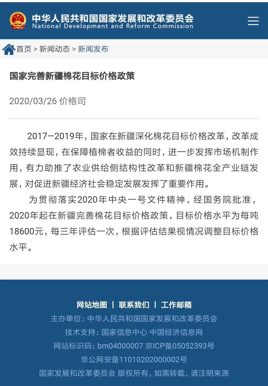 為貫徹落實2020年中央一號文件精神,經(jīng)國務(wù)院批準(zhǔn),2020年起在新疆完善棉花目標(biāo)價格政策,目標(biāo)價格水平為每噸18600元,每三年評估一次,根據(jù)評估結(jié)果視情況調(diào)整目標(biāo)價格水平。