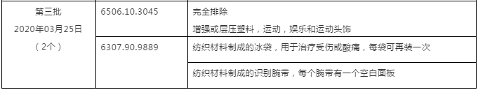 美國當(dāng)?shù)貢r(shí)間2020年3月25日,美國貿(mào)易代表辦公室(USTR)公布第三批3000億美元加征關(guān)稅商品清單項(xiàng)下的產(chǎn)品排除公告,共涉及12項(xiàng)排除產(chǎn)品,包含醫(yī)用冰袋塑料袋等產(chǎn)品,其中包括3類紡織服裝產(chǎn)品。被排除的產(chǎn)品在出口美國時(shí)將不再被加征7.5%的關(guān)稅。本公告列明的被排除產(chǎn)品的有效期為2019年9月1日至2020年9月1日。