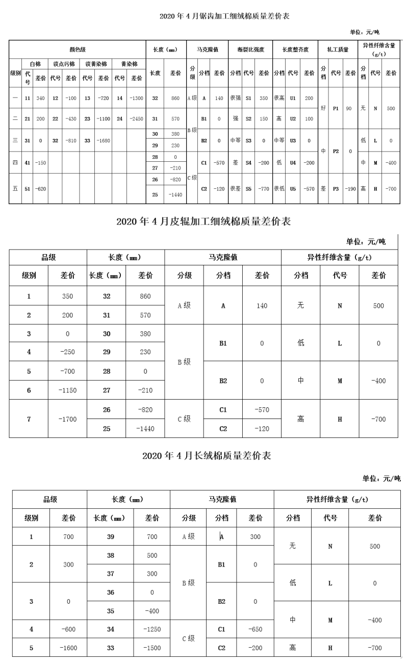 依據(jù)2020年3月的棉花公檢質(zhì)量數(shù)據(jù)、中國(guó)棉花協(xié)會(huì)棉花質(zhì)量?jī)r(jià)差自動(dòng)生成系統(tǒng)采集的棉花加工企業(yè)銷售成交價(jià)、紡織企業(yè)監(jiān)測(cè)點(diǎn)的采集數(shù)據(jù)以及當(dāng)月的中國(guó)棉花價(jià)格指數(shù),2020年4月鋸齒加工細(xì)絨棉質(zhì)量差價(jià)調(diào)整數(shù)據(jù)據(jù)此生成,并征求業(yè)內(nèi)相關(guān)專家的意見(jiàn),現(xiàn)做出如下調(diào)整(單位:元/噸):