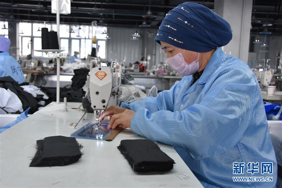 4月1日,女工在海原縣閩寧紡織制品有限公司扶貧車(chē)間里工作。近期,寧夏海原縣閩寧紡織工業(yè)園扶貧車(chē)間加快復(fù)工復(fù)產(chǎn)。扶貧車(chē)間要求員工工作時(shí)佩戴口罩,在廠房門(mén)口設(shè)置體溫檢測(cè)崗,落實(shí)疫情防控有關(guān)要求。目前,該園區(qū)扶貧車(chē)間在趕制一批出口馬來(lái)西亞和德國(guó)的服裝訂單。