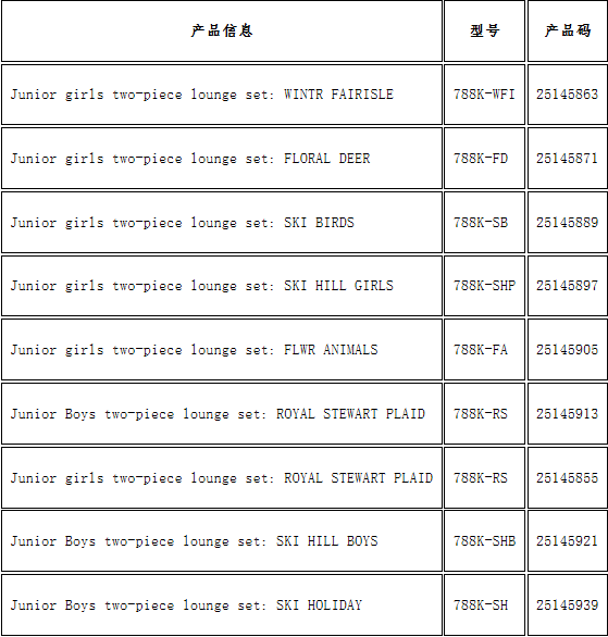此次召回產(chǎn)品為SportingLife的9款兩件套兒童睡衣。睡衣為100%純棉制,尺碼適合8-18歲兒童,男女裝均有。