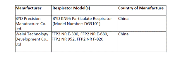 2020年4月3日獲得FDA認可的中國生產(chǎn)的非NIOSH認證的呼吸器有2個廠家,具體型號如下: