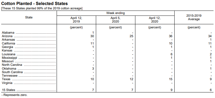 美國農(nóng)業(yè)部4月13日發(fā)布美國棉花生產(chǎn)報(bào)告顯示,截至2020年4月12日,美棉播種進(jìn)度9%,較前周增加2個(gè)百分點(diǎn),較去年同期增加2個(gè)百分點(diǎn),較過去五年均值增加3個(gè)百分點(diǎn)。目前有6個(gè)州開始播種,主要播種集中在亞利桑那州、路易斯安那州、加利福尼亞州、得克薩斯州。