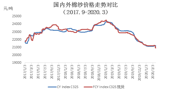 本月內(nèi)外棉紗價(jià)格均有所下降。國(guó)產(chǎn)32支純棉紗3月均價(jià)20444元/噸,較上月下降112元/噸,跌幅0.54%,較去年同期下跌2696元/噸,跌幅11.65%;進(jìn)口32支純棉紗月均價(jià)20360元/噸,較上月下降149元/噸,跌幅0.73%,較去年同期下跌2519元/噸,跌幅11.0%。