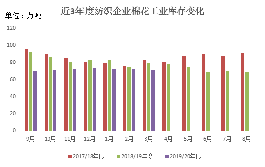 本月紡企開(kāi)工率上升,但受?chē)?guó)外疫情影響,外貿(mào)訂單大幅減少,原料價(jià)格也一路走低,企業(yè)隨用隨買(mǎi),庫(kù)存普遍較低。截至3月31日紡企棉花庫(kù)存量71.42萬(wàn)噸,較上月底減少0.76萬(wàn)噸,同比減少8.95萬(wàn)噸。其中42%企業(yè)減少棉花庫(kù)存,12%增加庫(kù)存,46%基本保持不變。