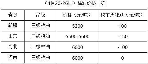 上周(4月20-26日),原油期貨再度暴跌,期貨豆油和豆粕低位徘徊,全球需求不足,外圍市場利空因素較多,拖累現(xiàn)貨行情。油棉市場經(jīng)營兩難,棉籽持價難下,但棉副產(chǎn)品弱勢局面持續(xù),棉油、棉粕跌勢難止,油棉廠壓榨利潤不佳,個別廠家停機避險,市場仍處進一步調(diào)整中。