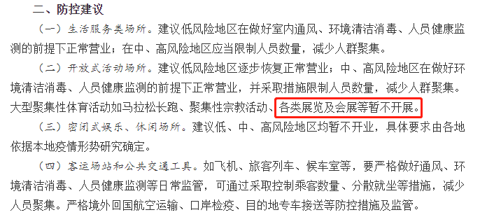 2020年,一場疫情給全球會展行業(yè)按下了“暫停鍵”。雖然全國疫情防控形勢持續(xù)向好,但國際防控形勢變得尤為嚴峻復(fù)雜。根據(jù)國務(wù)院于2020年4月6日下發(fā)的《關(guān)于進一步做好重點場所重點單位重點人群新冠肺炎疫情防控相關(guān)工作的通知》?!锻ㄖ分赋龃笮途奂泽w育活動如馬拉松長跑、聚集性宗教活動、各類展覽及會展等暫不開展。