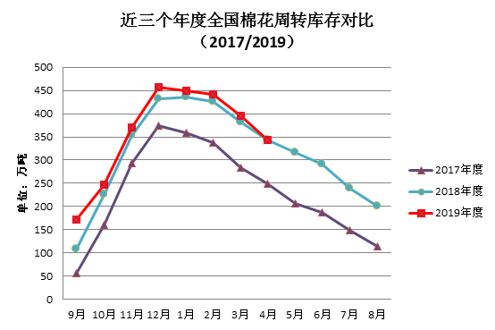 4月國內(nèi)紡企生產(chǎn)基本恢復,但需求不足,導致成品積壓,用棉企業(yè)采購棉花比較謹慎,月末周轉(zhuǎn)庫存繼續(xù)下降。據(jù)中國棉花協(xié)會棉花物流分會對全國18個省市152家棉花交割和監(jiān)管倉庫調(diào)查數(shù)據(jù)顯示:4月底全國棉花周轉(zhuǎn)庫存總量約344萬噸,較上月減少52.32萬噸,降幅13.2%,降幅較上月擴大2.78%。