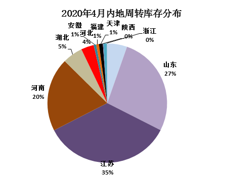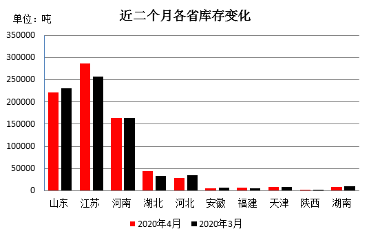 分省份看,江蘇省庫存量居首位為28.62萬噸,山東省次之為22.21萬噸,河南省居第三位為16.35萬噸,湖北省為4.47萬噸,河北省為2.83萬噸,其他省在萬噸以下。