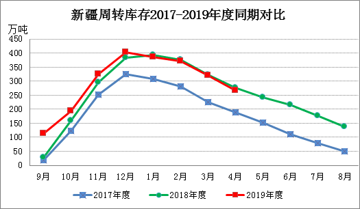2019年度(2019年9月-2020年4月)出疆棉公路與鐵路共發(fā)運283.51萬噸,同比增加69.78萬噸。