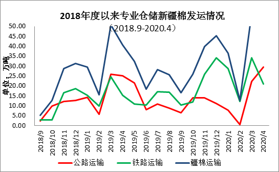 4月新疆棉花專業(yè)倉儲庫出疆發(fā)運量為50.56萬噸,環(huán)比減少5.91萬噸,同比增加10.10萬噸。