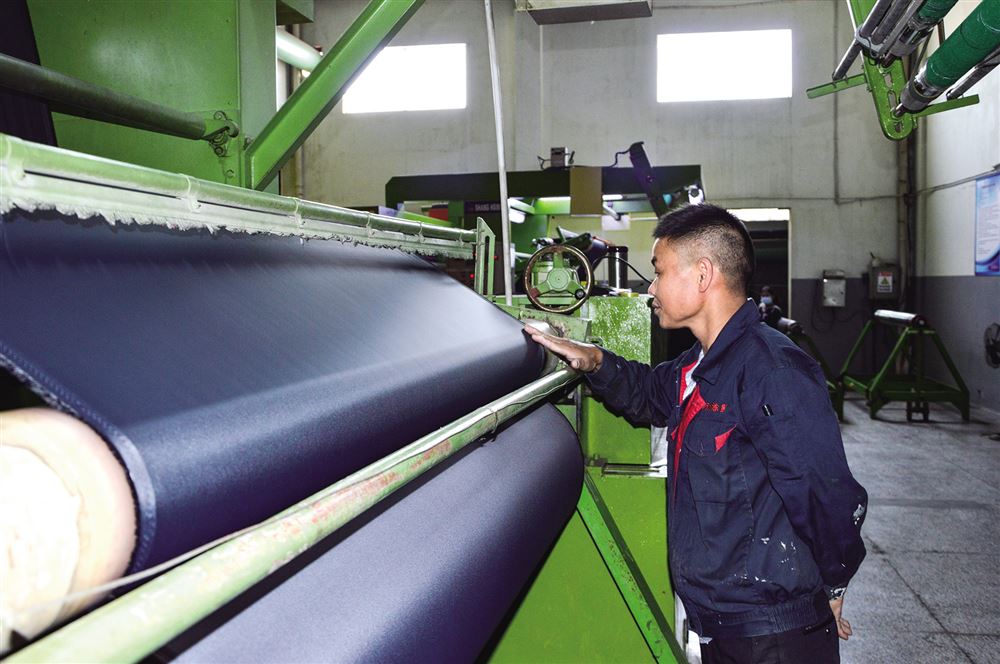 圖為吳江市盛澤萬利涂層廠員工正在抓緊生產(chǎn)箱包面料。