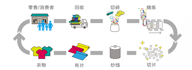 德國南毛集團與伊藤忠株式會社攜手打造的RENU項目致力于解決服裝行業(yè)過度浪費的問題,并利用被丟棄的紡織品來實現(xiàn)時尚界的循環(huán)經(jīng)濟。RENU纖維是經(jīng)過GRS(全球回收標(biāo)準(zhǔn))認證的再生滌綸,可從紡織廢料和舊衣服中回收?;厥盏囊挛锱c紡織廢料通過粉碎及獨特的解聚和精制工藝,被加工聚合成新的滌綸纖維。同時通過采用一種特殊技術(shù),可以很容易地將回收的紡織品去色,使再生滌綸具有與原始滌綸一樣的著色力。此外回收滌綸的質(zhì)量和性能不取決于回收品本身的質(zhì)量:RENU技術(shù)可應(yīng)用于幾乎任何類型的回收品,無論消費者是否使用過,只要含有滌綸即可。