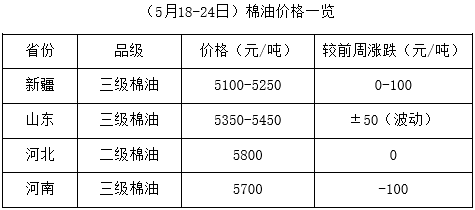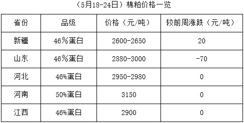 上周(5月18-24日),“兩會”召開期間,市場經(jīng)濟穩(wěn)步復蘇,期貨大豆及豆類產(chǎn)品震蕩調(diào)整,上漲幅度有限,難以有力支撐棉副產(chǎn)品行情,而棉籽處青黃不接之時,各地資源匱乏,價格高位有漲,油棉榨利仍處虧損,市場經(jīng)營難度不減。
