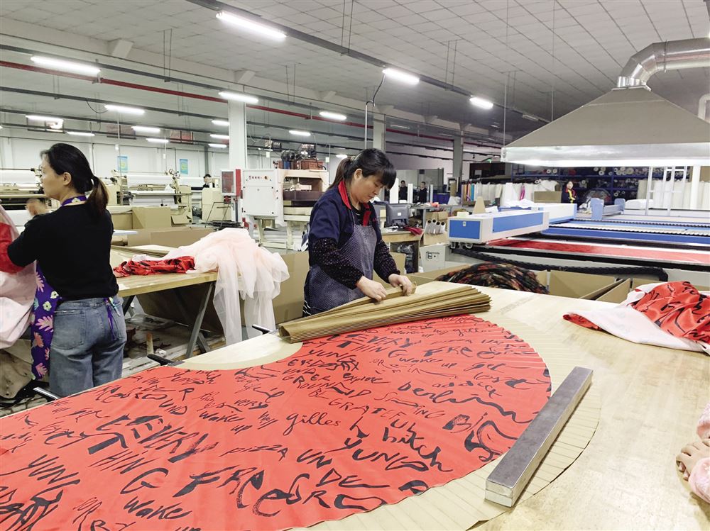 近日在蘇州歐夢尼亞褶皺面料有限公司的生產(chǎn)車間看到,多名女工正在對一塊扇形面料進行手工褶皺加工,提高面料的附加值,增加時尚感。