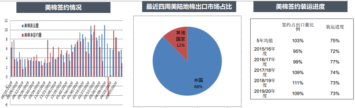 據(jù)USDA報(bào)告,5月14日一周,2019/20年度美國(guó)陸地棉簽約量2.92萬(wàn)噸,其中中國(guó)凈簽約量3.48萬(wàn)噸,其他幾個(gè)國(guó)家取消合約較大,截至當(dāng)周累計(jì)簽約量369.48萬(wàn)噸,簽約進(jìn)度109%,5年均值103%。當(dāng)周裝運(yùn)量5.72萬(wàn)噸,截至當(dāng)周累計(jì)裝運(yùn)量245.17萬(wàn)噸,裝運(yùn)進(jìn)度72%,5年均值75%。最近四周,中國(guó)突然大量簽約美國(guó)陸地棉,我們大膽推測(cè)這其中可能更多是國(guó)家行為。