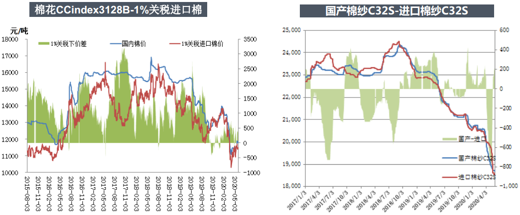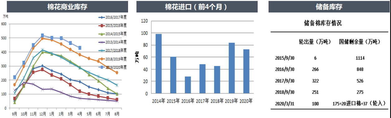 國(guó)儲(chǔ)庫(kù)存截止3月31日,儲(chǔ)備棉庫(kù)存有232萬(wàn)噸。往年5月已開(kāi)始輪出儲(chǔ)備棉,今年到現(xiàn)在仍沒(méi)有任何輪出消息,考慮今年棉價(jià)太低,國(guó)家不會(huì)再輪出增加市場(chǎng)負(fù)擔(dān),預(yù)計(jì)今年輪出可能性較低。