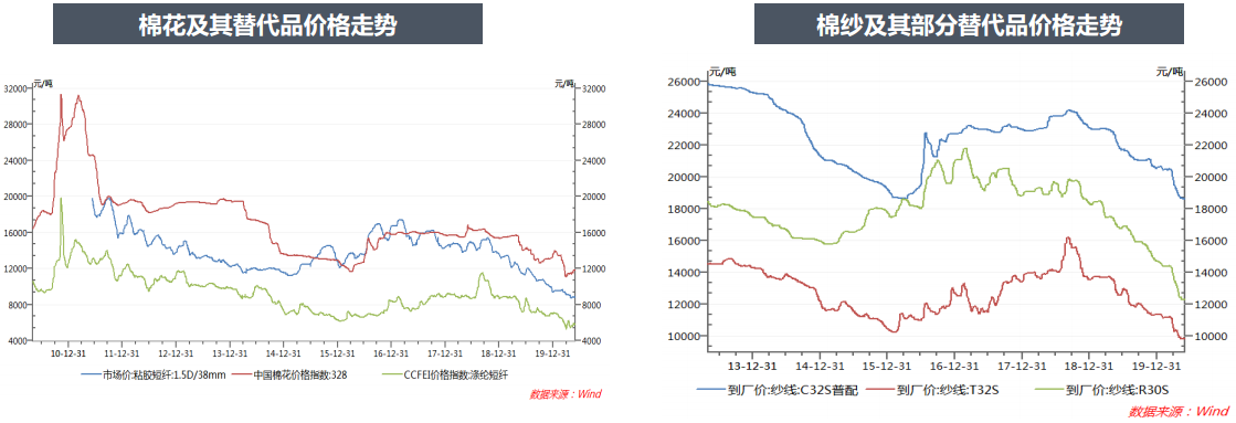 目前棉花、滌綸短纖、粘膠短纖價(jià)格都位于歷史相對(duì)低位,棉紗替代品價(jià)格也基本位于歷史價(jià)格低位。最近一周滌綸短纖和粘膠短纖價(jià)格都出現(xiàn)小幅反彈。