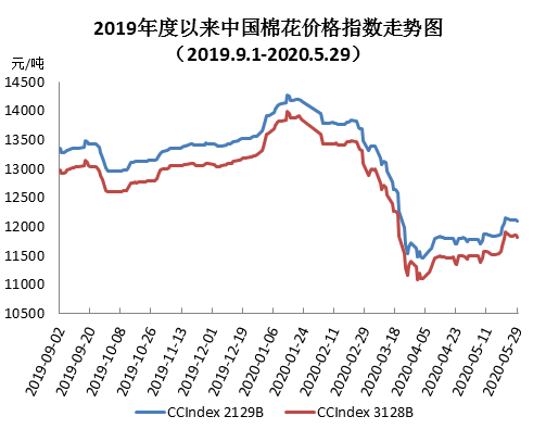 5月國(guó)內(nèi)疫情維持穩(wěn)定,經(jīng)濟(jì)環(huán)境進(jìn)一步好轉(zhuǎn),棉花現(xiàn)貨價(jià)溫和上漲。紡企雖已正常復(fù)產(chǎn),但下游訂單依然不佳,多數(shù)企業(yè)開(kāi)機(jī)率不足,資金運(yùn)轉(zhuǎn)困難,原料庫(kù)存多保持隨用隨買(mǎi)。月末中國(guó)棉花價(jià)格指數(shù)(CCIndex3128B)11807元/噸,較上月末上漲306元;月均價(jià)11644元/噸,環(huán)比上漲248元,同比下跌3425元。