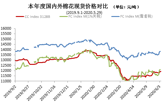 5月歐洲疫情好轉(zhuǎn),經(jīng)濟(jì)逐步重新開(kāi)放,美國(guó)疫情尚未出現(xiàn)明確拐點(diǎn),國(guó)際環(huán)境復(fù)雜多變,外棉價(jià)格月內(nèi)震蕩,月末收跌。中國(guó)進(jìn)口棉價(jià)格指數(shù)FCIndexM月均67.78美分/磅,環(huán)比上漲2.64美分。月末66.26美分/磅,低于上月末2.32美分/磅,1%關(guān)稅下折人民幣11522元/噸,低于同期國(guó)內(nèi)現(xiàn)貨285元,隨著外棉走弱,內(nèi)外棉價(jià)差由4月末的-405元/噸再次回歸正值,波動(dòng)幅度690元/噸。