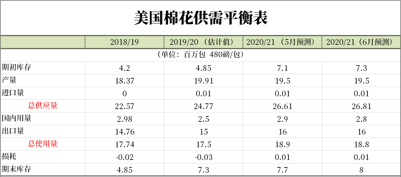 美國農(nóng)業(yè)部發(fā)布6月全球供需預測顯示,美國2019/20年度棉花消費量調(diào)減20萬包為250萬包、2020/21年度消費量調(diào)減10萬包。2019/20年度、2020/21年度期末庫存730萬包、800萬包。2020/21年度庫存消費比為43%,同比略微上升,明顯高于近幾年水平,但遠低于2007/08年度的55%。