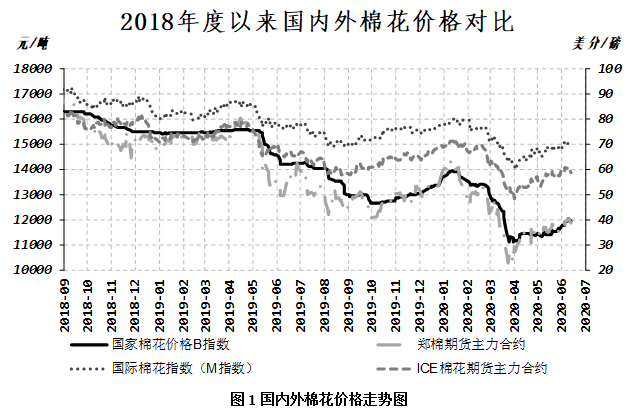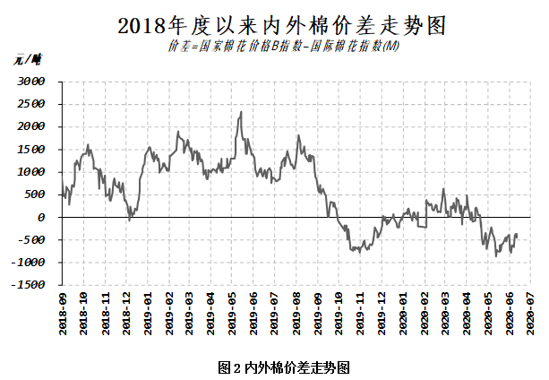 1個(gè)月以來(lái),國(guó)內(nèi)外棉價(jià)均有所上漲,國(guó)外棉價(jià)漲幅明顯大于國(guó)內(nèi)。6月12日,國(guó)家棉花價(jià)格B指數(shù)11951元/噸,較上月上漲472元/噸,鄭棉期貨主力合約11870元/噸,較上月上漲165元/噸;國(guó)際棉花M指數(shù)69.1美分/磅,較上月上漲2.26美分/磅,ICE棉花期貨主力合約59.03美分/磅,較上月上漲2.76美分/磅;內(nèi)外棉價(jià)差-349元/噸,較上月擴(kuò)大7元/噸(圖1、圖2)。