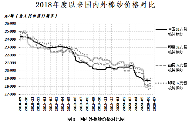 1個(gè)月以來(lái),國(guó)內(nèi)外棉紗價(jià)格普遍下跌,國(guó)內(nèi)棉紗價(jià)格跌幅明顯小于國(guó)外棉紗。6月12日,國(guó)內(nèi)32支純棉普梳紗18745元/噸,較上月下跌50元/噸,印度32支純棉普梳紗18076元/噸,較上月下跌1921元/噸,越南32支純棉普梳紗18360元/噸,較上月下跌1054元/噸,印度尼西亞32支純棉普梳紗17659元/噸,較上月下跌2232元/噸(圖3)。