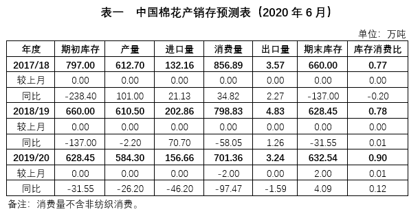 本期棉花產(chǎn)需預(yù)測將2019/20年度棉花消費(fèi)量調(diào)減2萬噸至701.36萬噸。