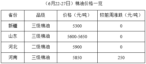 本周,期貨豆油反彈受阻回落,現(xiàn)貨相應(yīng)調(diào)整。周末沿海地區(qū)一級(jí)豆油價(jià)格至5780-5880元/噸,較前周小跌20元/噸。6-8月到港大豆量較大,豆油廠開(kāi)工率提升,豆油庫(kù)存壓力較大,利空棉油行情。但因目前棉籽貨少價(jià)高,油棉廠虧損持續(xù),加之開(kāi)工率有限,廠家對(duì)棉油持價(jià)出售,多數(shù)地區(qū)穩(wěn)定為主,個(gè)別貨少者提價(jià)出貨。距離新棉油上市時(shí)間較長(zhǎng),未來(lái)棉油在參照豆油走勢(shì)前提下,保持相對(duì)持價(jià)狀態(tài)運(yùn)行。