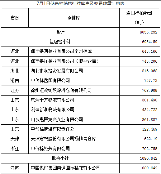 中國儲(chǔ)備棉管理有限公司定于7月1日上市銷售儲(chǔ)備棉重量8035.232噸,共37捆。具體庫點(diǎn)及數(shù)量見下表。