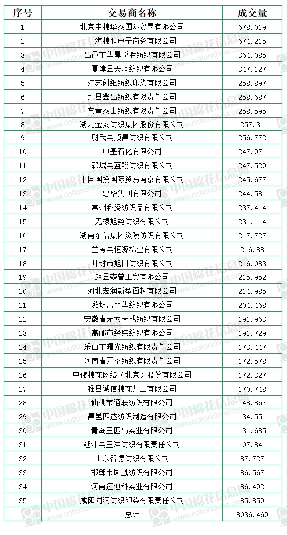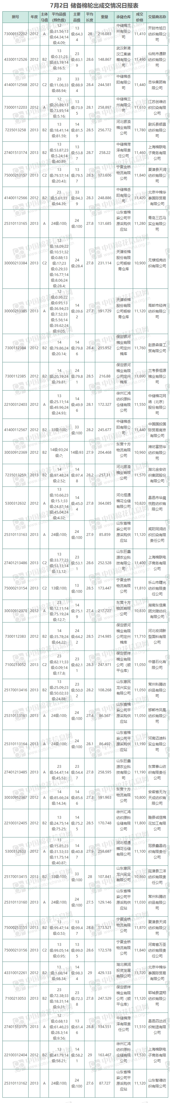中國(guó)儲(chǔ)備棉管理有限公司定于7月2日上市銷售儲(chǔ)備棉重量8036.469噸,實(shí)際成交8036.469噸,成交率100%,成交均價(jià)11372元/噸,較1日上漲233元/噸,折3128價(jià)格12769元/噸,較1日上漲220元/噸。