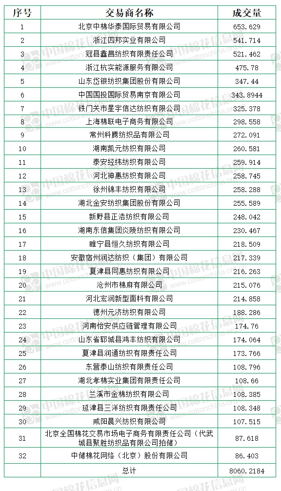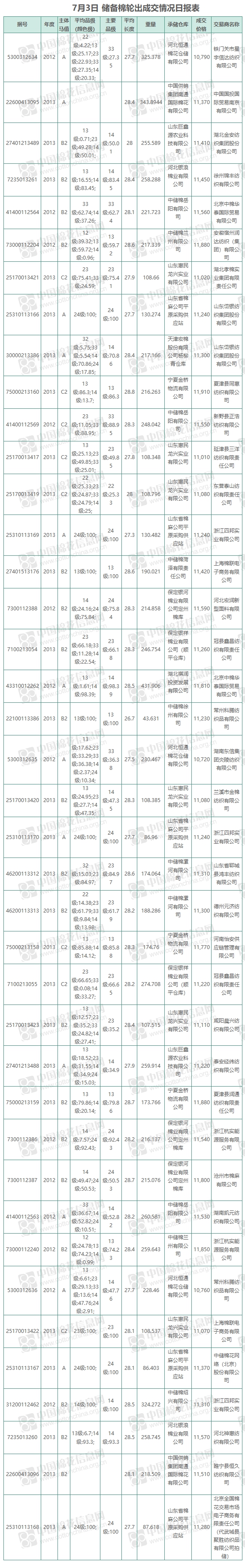 中國(guó)儲(chǔ)備棉管理有限公司定于7月3日上市銷售儲(chǔ)備棉重量8060.2184噸,實(shí)際成交8060.2184噸,成交率100%,成交均價(jià)11398元/噸,較2日上漲26元/噸,折3128價(jià)格12794元/噸,較2日上漲25元/噸。