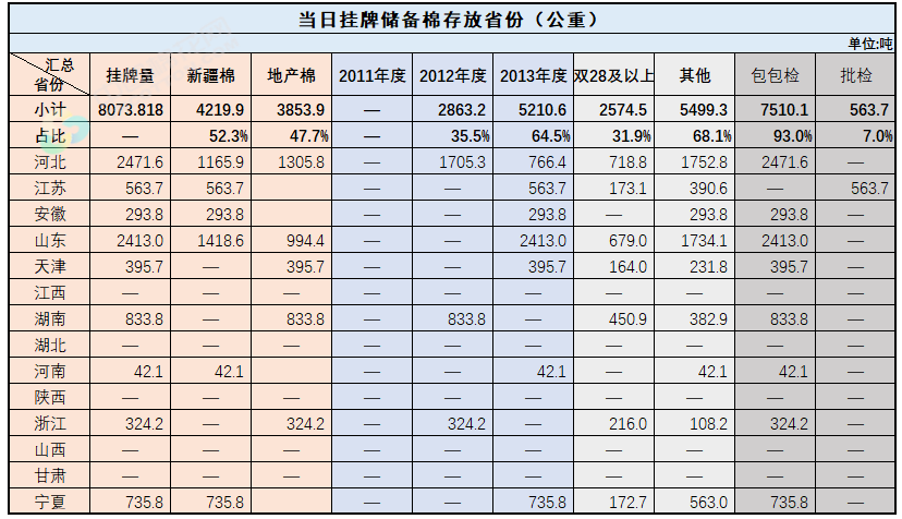 1.當(dāng)日輪出上市儲(chǔ)備棉中有部分為分批抽樣公檢。抽樣比率及抽樣方法按照棉花國(guó)家標(biāo)準(zhǔn)規(guī)定,品質(zhì)指標(biāo)包括顏色級(jí)、軋工質(zhì)量、長(zhǎng)度、馬克隆值、斷裂比強(qiáng)度、長(zhǎng)度整齊度指標(biāo);重量采用原入庫(kù)公檢結(jié)果,不再重新檢驗(yàn)。