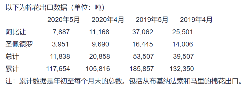 周五公布的港口初步數(shù)據(jù)顯示,2020年前5個(gè)月科特迪瓦出口棉花117654噸,同比下滑37%。阿比讓的主要港口也是科特迪瓦內(nèi)陸鄰國馬里和布基納法索生產(chǎn)的棉花的主要出口點(diǎn)。