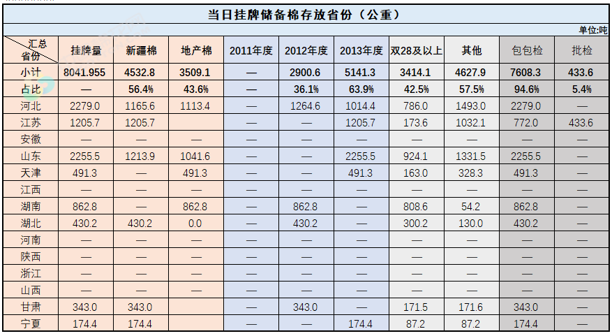 中國儲備棉管理有限公司定于7月7日上市銷售儲備棉重量8041.9553噸,共41捆。具體庫點及數(shù)量見下表。
