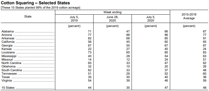 美國(guó)農(nóng)業(yè)部7月6日發(fā)布的美國(guó)棉花生產(chǎn)報(bào)告顯示,截至7月5日,美棉蕾鈴率為47%,前周為35%,去年同期為44%,5年均值為48%;美棉結(jié)鈴進(jìn)度為13%,前周為9%,去年同期為11%,5年均值為13%;美棉優(yōu)良率為43%,前周為41%,去年同期為54%,其中得州優(yōu)良率為22%,較前周增加1個(gè)百分點(diǎn)。