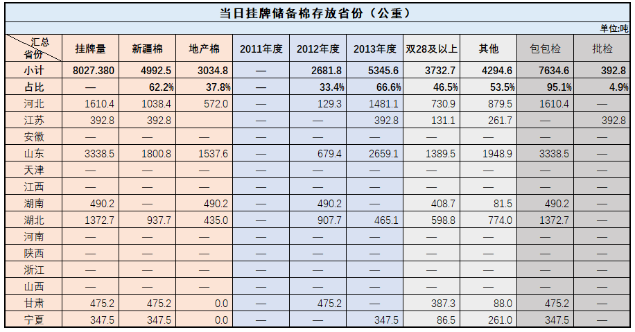 中國儲備棉管理有限公司定于7月14日上市銷售儲備棉重量8027.3804噸,共32捆。具體庫點及數(shù)量見下表。