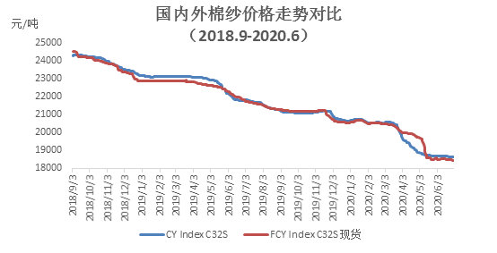 6月內(nèi)外棉紗價(jià)格繼續(xù)維持跌勢(shì),進(jìn)口紗價(jià)格跌幅大于國(guó)內(nèi)。國(guó)產(chǎn)32支純棉紗6月均價(jià)18692元/噸,較上月下降47元/噸,跌幅0.25%,較去年同期下跌3215元/噸,跌幅14.7%;進(jìn)口32支純棉紗月均價(jià)18515元/噸,較上月下降311元/噸,跌幅1.65%,較去年同期下跌3521元/噸,跌幅15.98%。