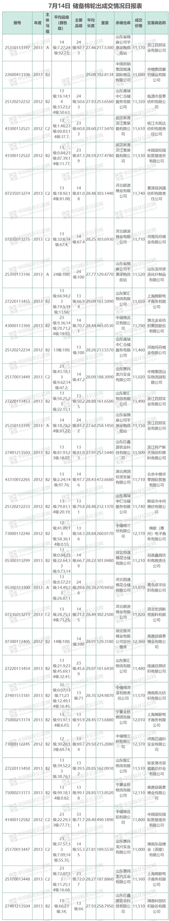 中國儲備棉管理有限公司定于7月14日上市銷售儲備棉重量8027.3804噸,實際成交8027.3804噸,成交率100%,成交均價11601元/噸,較13日下跌57元/噸,折3128價格12794元/噸,較13日下跌104元/噸。