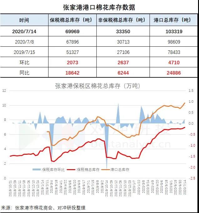 據(jù)張家港市棉花商會,截止2020年7月14日,張家港非保稅棉33350噸,保稅棉69969噸,共103319噸。進(jìn)區(qū)6757噸,出區(qū)1975噸。