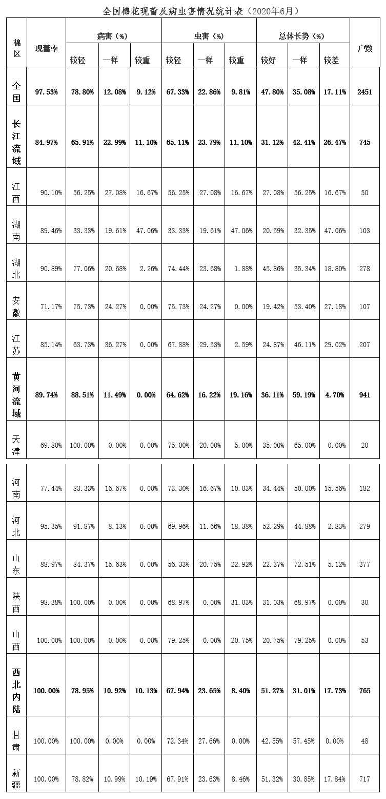 截止6月底,全國(guó)棉花現(xiàn)蕾率97.53%,高于去年同期3個(gè)百分點(diǎn),病蟲(chóng)害發(fā)生程度較輕。其中病害較輕的占78.80%,同比高15.78個(gè)百分點(diǎn);蟲(chóng)害較輕的占67.33%,同比高1.77個(gè)百分點(diǎn);長(zhǎng)勢(shì)較好占47.80%,同比高37.17個(gè)百分點(diǎn)。