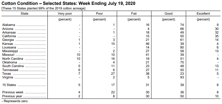 美國(guó)農(nóng)業(yè)部7月20日發(fā)布的美國(guó)棉花生產(chǎn)報(bào)告顯示,截至7月19日,美棉蕾鈴率為73%,前周為63%,去年同期為73%,5年均值為75%。美棉結(jié)鈴進(jìn)度為27%,前周為18%,去年同期為29%,5年均值為32%。美棉優(yōu)良率為47%,前周為44%,去年同期為60%。其中得州優(yōu)良率為28%,較前周增加5個(gè)百分點(diǎn),差苗率為34%,較前周減少7個(gè)百分點(diǎn)。