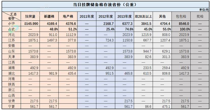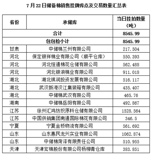 中國(guó)儲(chǔ)備棉管理有限公司定于7月22日上市銷售儲(chǔ)備棉重量8545.99噸,共32捆。具體庫(kù)點(diǎn)及數(shù)量見下表。