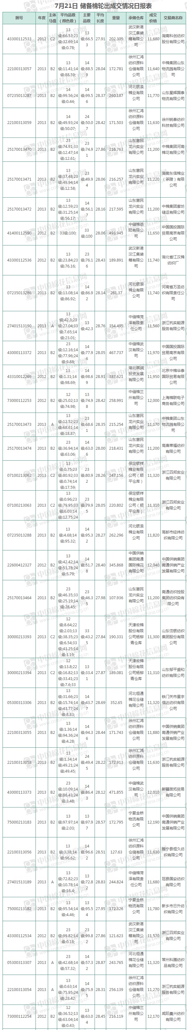 中國儲備棉管理有限公司定于7月21日上市銷售儲備棉重量8592.978噸,實(shí)際成交8592.978噸,成交率100%,成交均價(jià)11637元/噸,較20日上漲9元/噸,折3128價(jià)格12814元/噸,較20日上漲57元/噸。