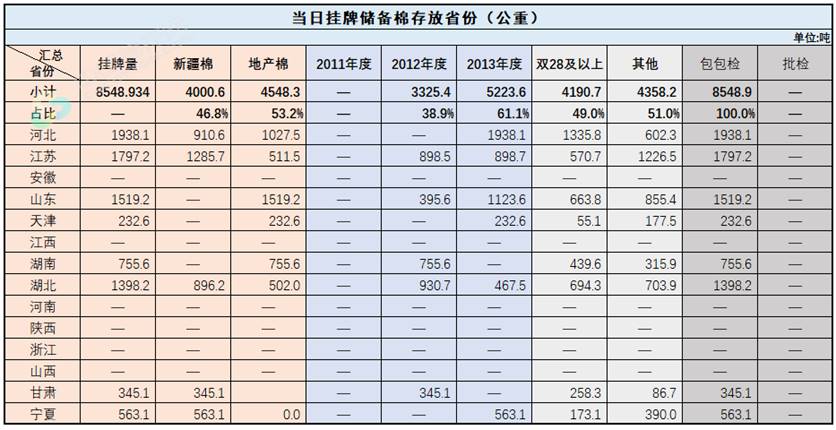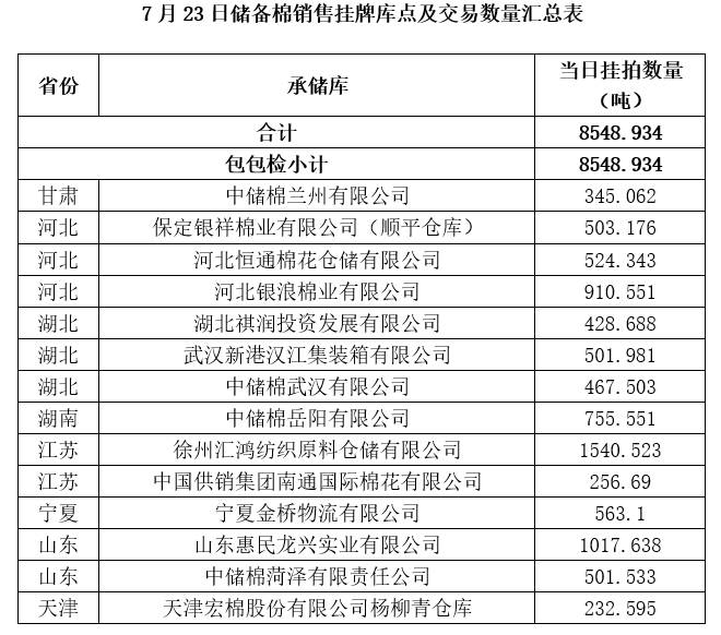 中國儲(chǔ)備棉管理有限公司定于7月23日上市銷售儲(chǔ)備棉重量8548.934噸,共35捆。具體庫點(diǎn)及數(shù)量見下表。