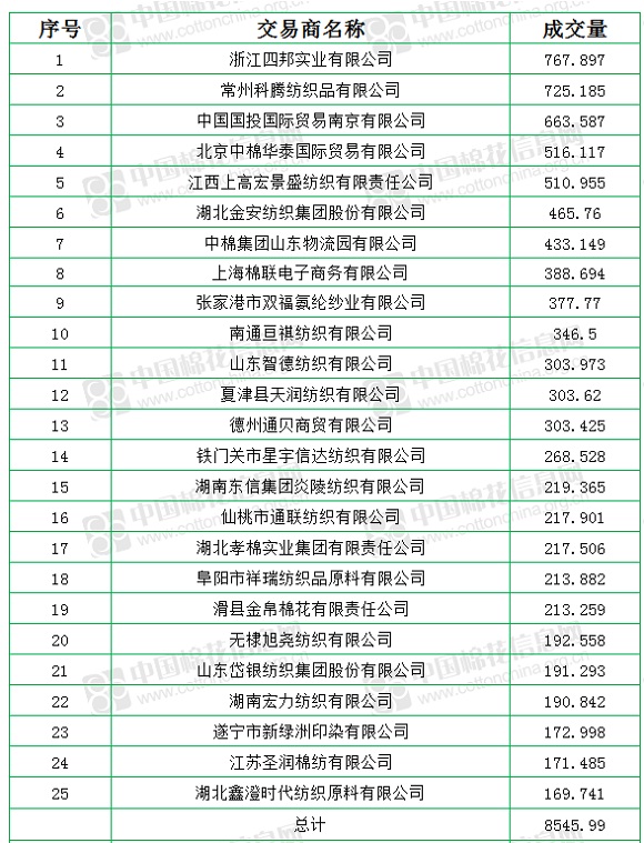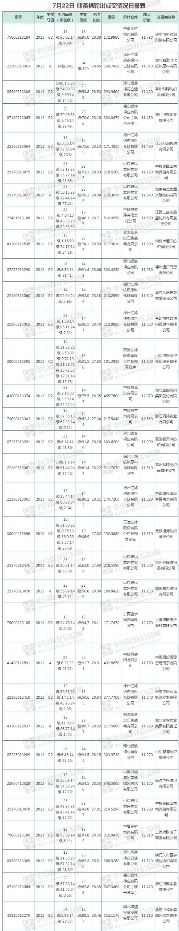 中國儲(chǔ)備棉管理有限公司定于7月22日上市銷售儲(chǔ)備棉重量8545.99噸,實(shí)際成交8545.99噸,成交率100%,成交均價(jià)11656元/噸,較21日上漲19元/噸,折3128價(jià)格12857元/噸,較21日上漲43元/噸。