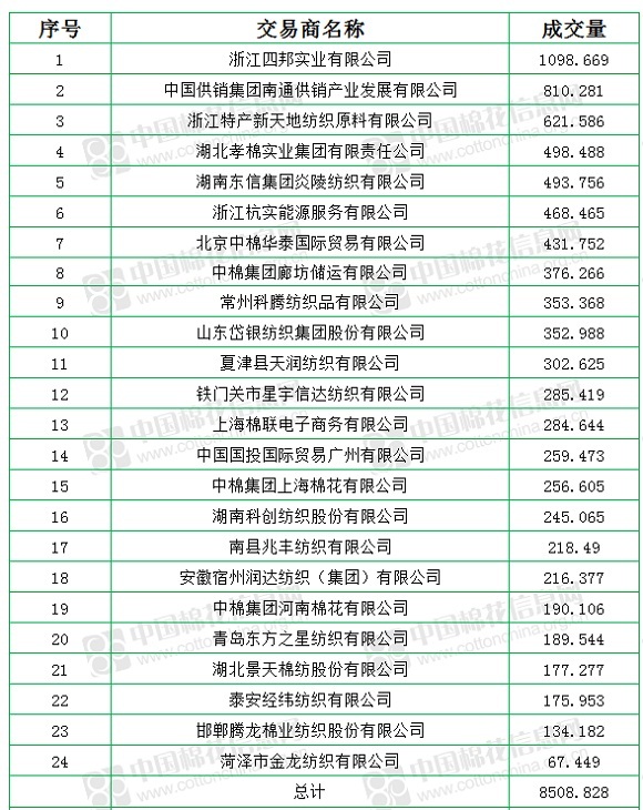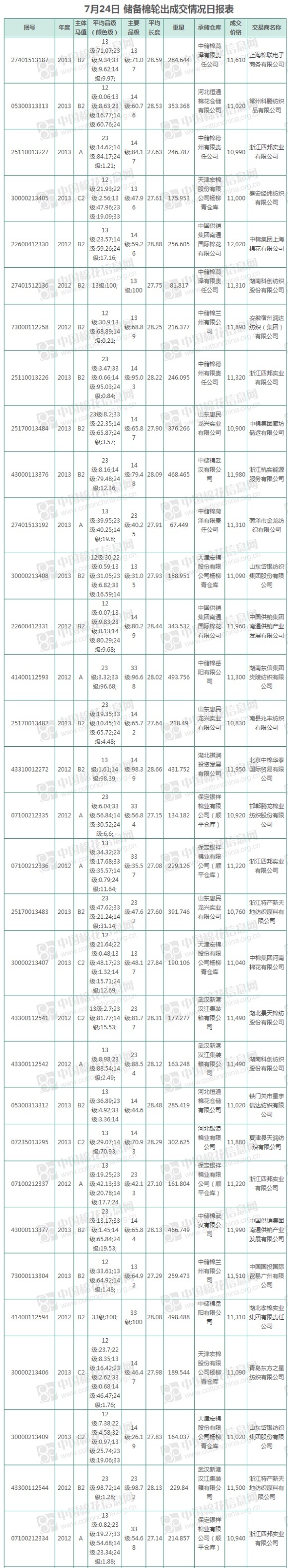 中國(guó)儲(chǔ)備棉管理有限公司定于7月24日上市銷售儲(chǔ)備棉重量8508.828噸,實(shí)際成交8508.828噸,成交率100%,成交均價(jià)11393元/噸,較23日下跌168元/噸,折3128價(jià)格12736元/噸,較23日下跌34元/噸。