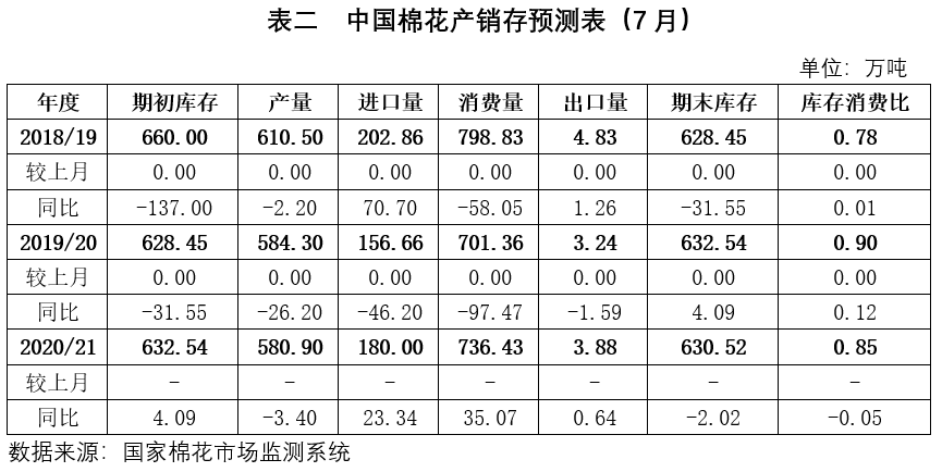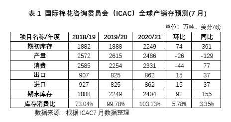 國際棉花市場從8月開始進(jìn)入2020/21年度。根據(jù)國際棉花咨詢委員會(huì)(ICAC)7月1日發(fā)布的全球棉花產(chǎn)需預(yù)測,2020棉花年度全球棉花產(chǎn)量2486萬噸,同比減少129萬噸;消費(fèi)量2331萬噸,同比增加77萬噸(見表1)。產(chǎn)大于需狀況由2019/20年度的361萬噸縮至2020/21年度的155萬噸,減幅高達(dá)57%。2020/21年度全球棉花產(chǎn)大于需格局的改善及各國經(jīng)濟(jì)刺激政策對(duì)市場信心的逐步修復(fù),將為棉花價(jià)格提供上漲動(dòng)力,但疫情對(duì)世界經(jīng)濟(jì)的沖擊還在繼續(xù)發(fā)展演變,國際貿(mào)易關(guān)系和地緣政治沖突等不確定性因素令市場擔(dān)憂,國際棉花價(jià)格在反復(fù)波動(dòng)中整體上移概率較大。
