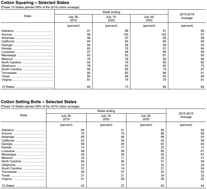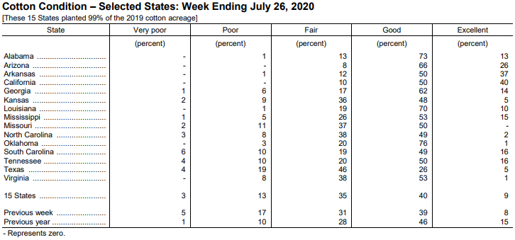 美國農(nóng)業(yè)部7月27日發(fā)布的美國棉花生產(chǎn)報告顯示,截至7月26日,美棉蕾鈴率為84%,前周為73%,去年同期為84%,5年均值為84%。美棉結(jié)鈴進(jìn)度為42%,前周為27%,去年同期為42%,5年均值為44%。美棉優(yōu)良率為49%,前周為47%,去年同期為61%,其中得州優(yōu)良率為31%,較前周增加3個百分點,差苗率為23%,較前周減少11個百分點。